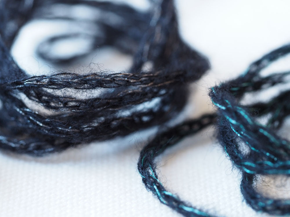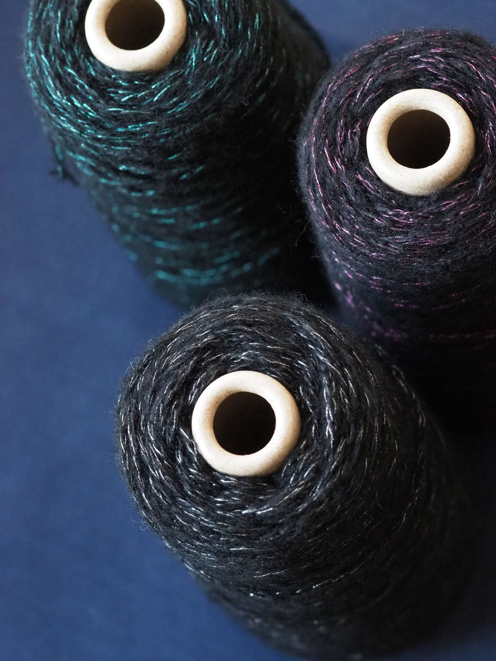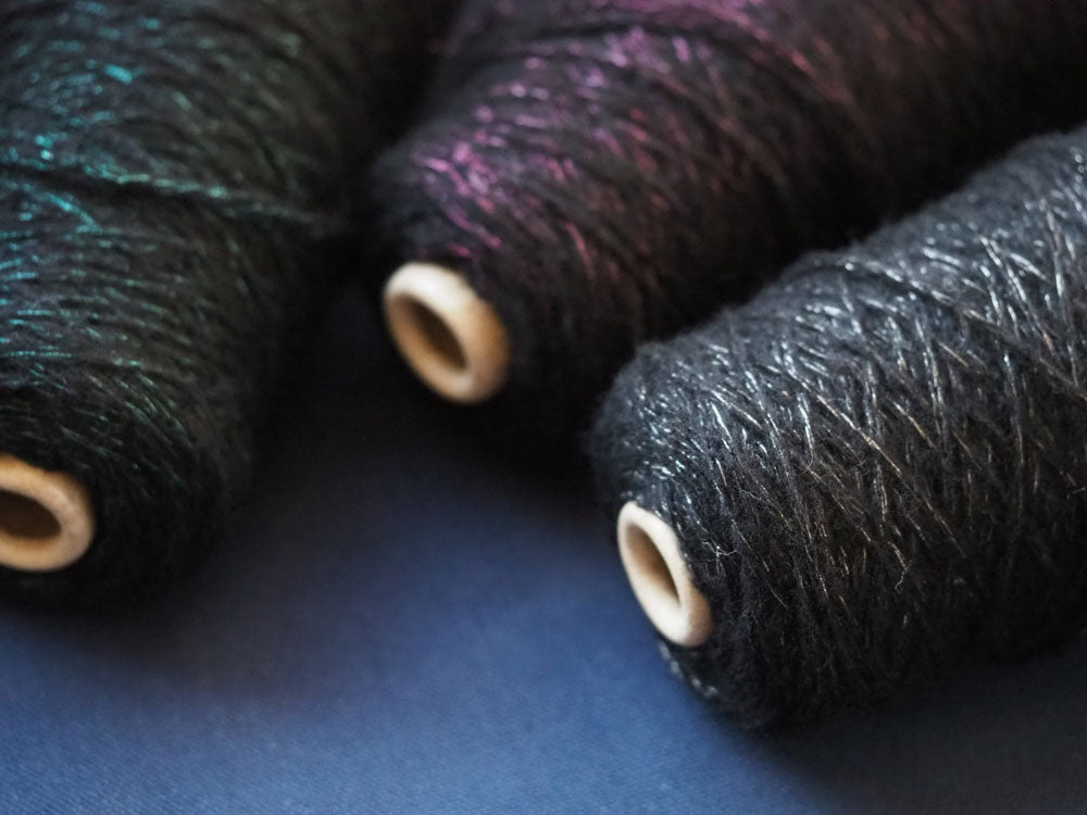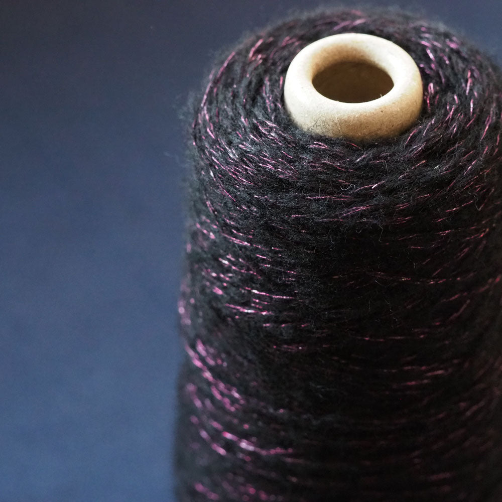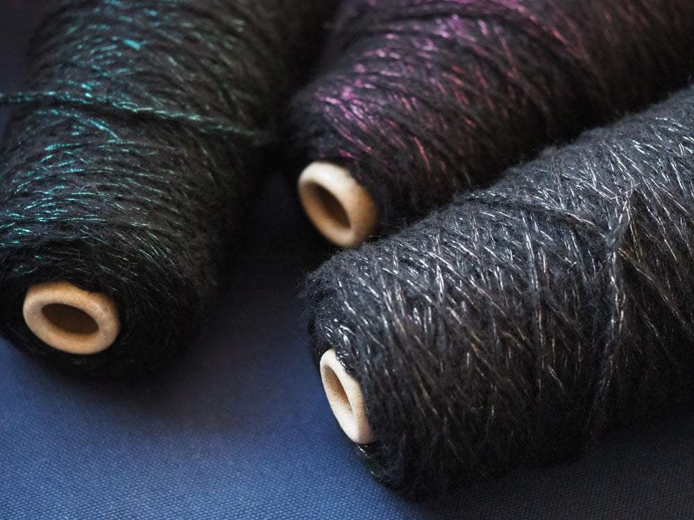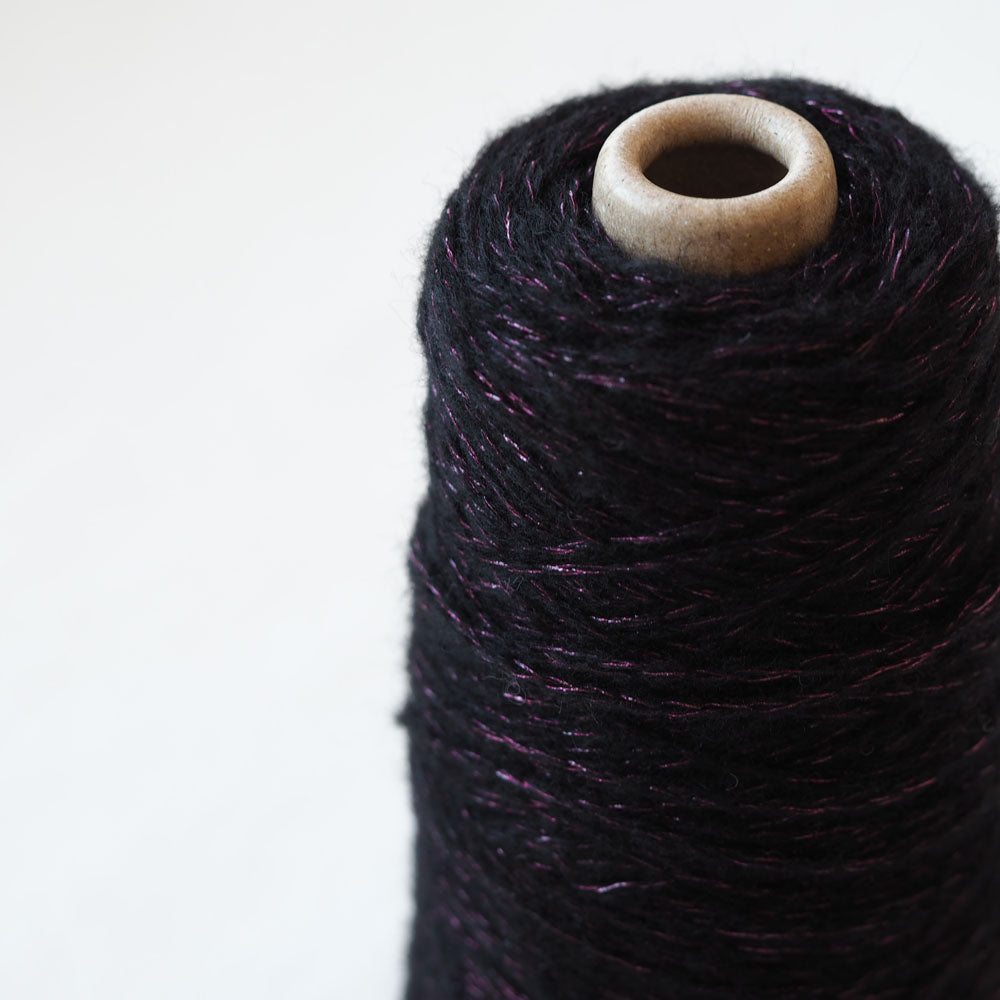 上質なアルパカ混タム糸(ブラック)と繊細な極細のラメをふんわりとリリヤーン加工しました。