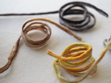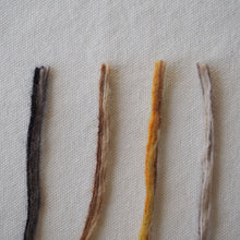 このため撚糸とは異なる味わいの、色が溶けあったようなやさしい表情が出ます。糸の形状は「きし麺」のような平たい形です。
